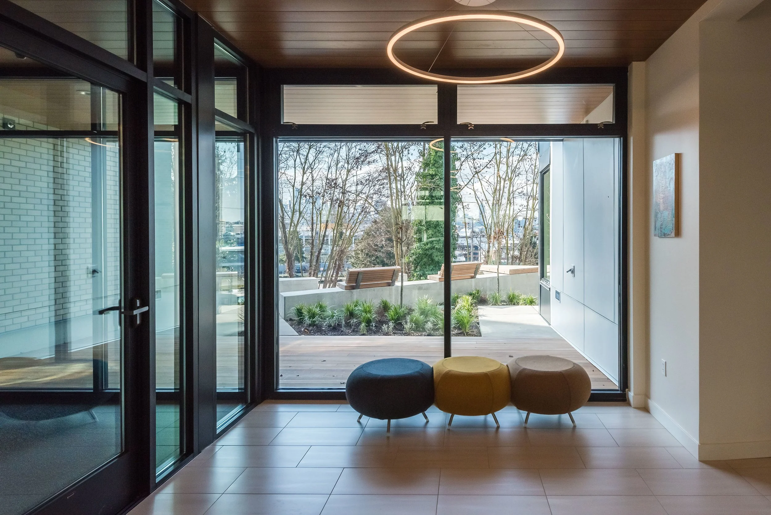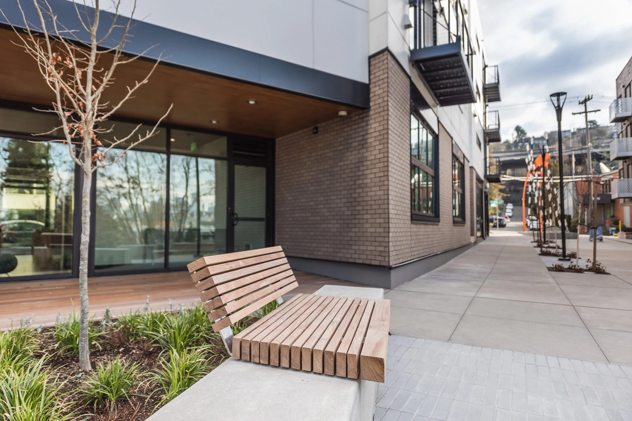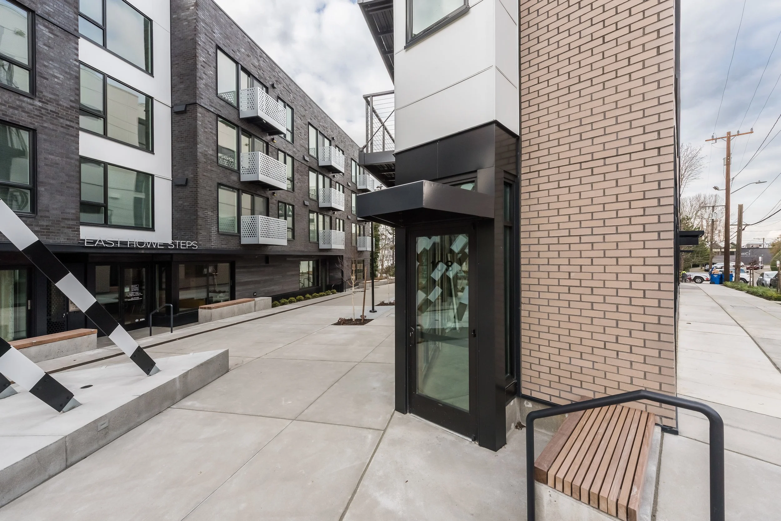 East Howe Steps is a four-story mixed-use building with two “towers” organized around a central public plaza and semi-public courtyards. The heart of the project is the public plaza—aligned with the Howe Street Steps, the longest urban staircase in Seattle and a popular pedestrian route. At street level, small-scale shops and restaurants activate the plaza and street edges. Three interior courtyards serve as open-air rooms for apartment residents, providing daylight, natural ventilation and social spaces separated from the busy street frontage.