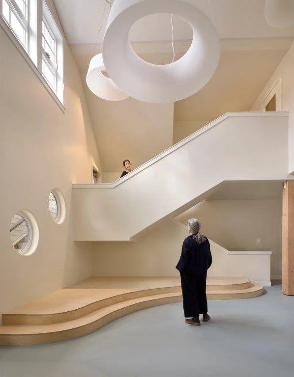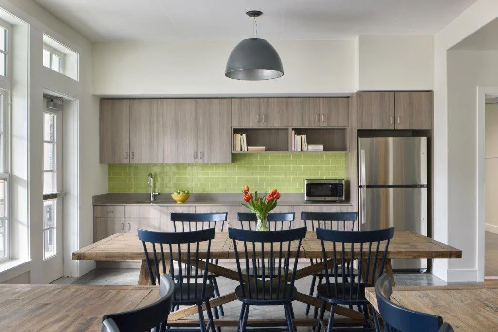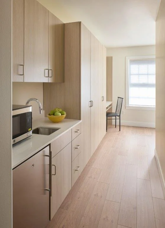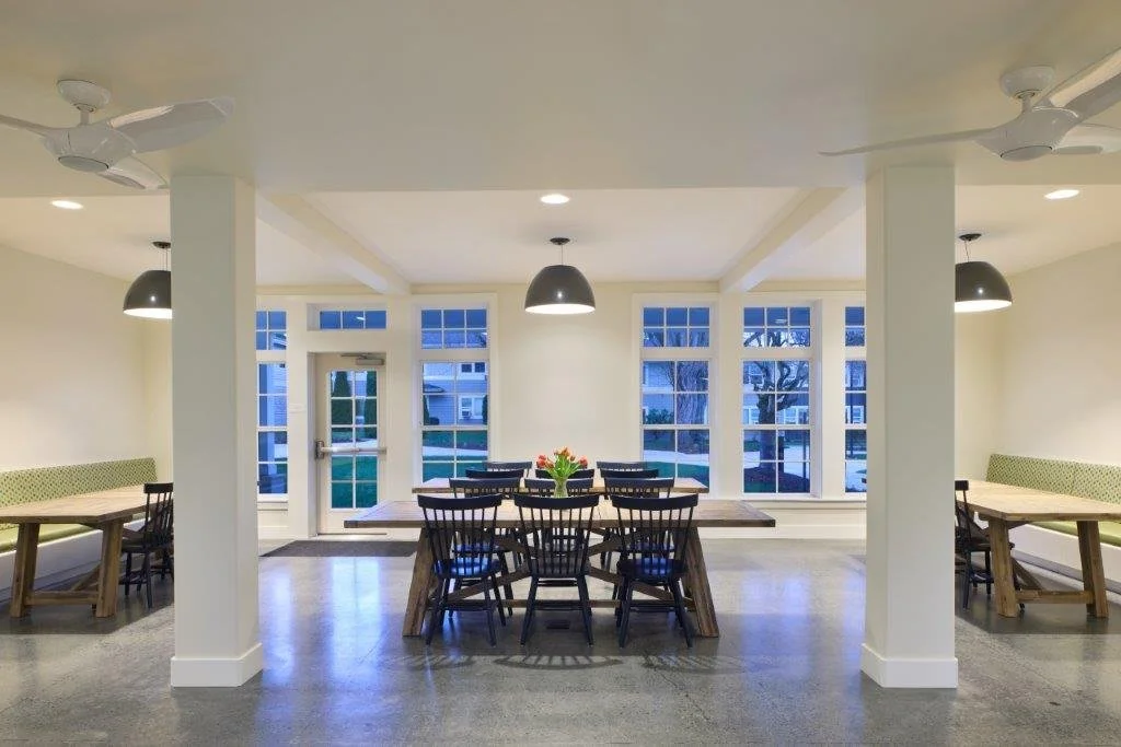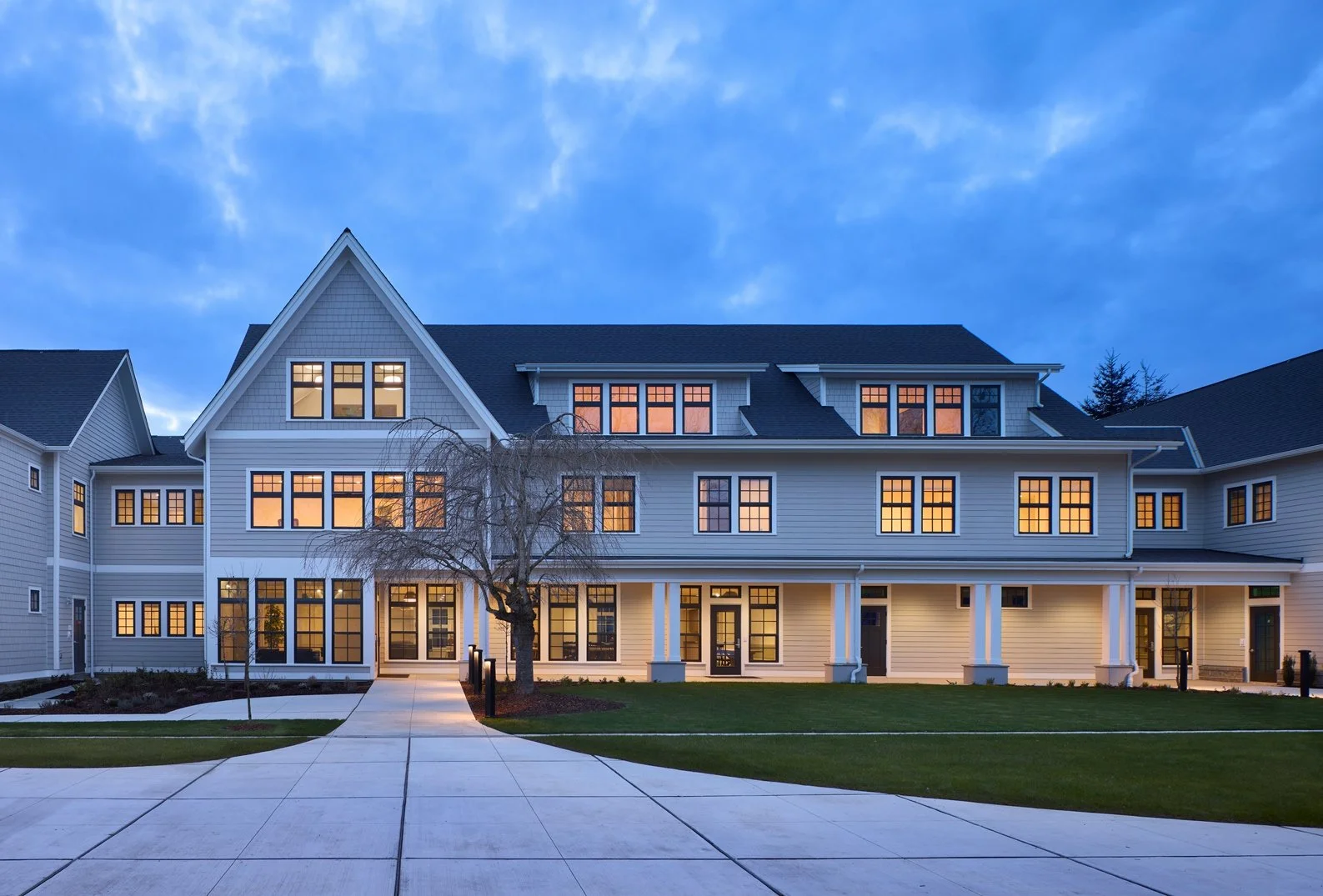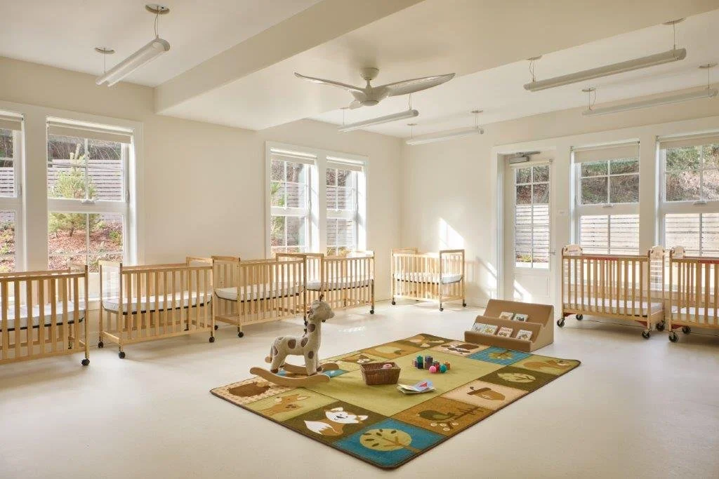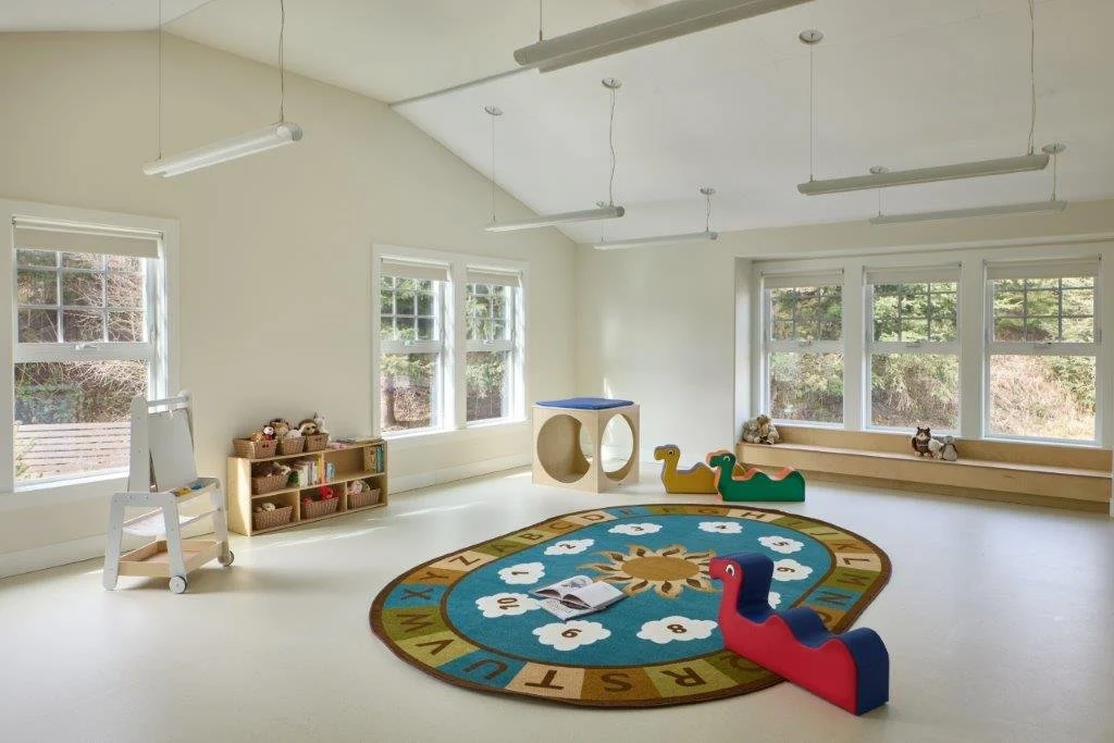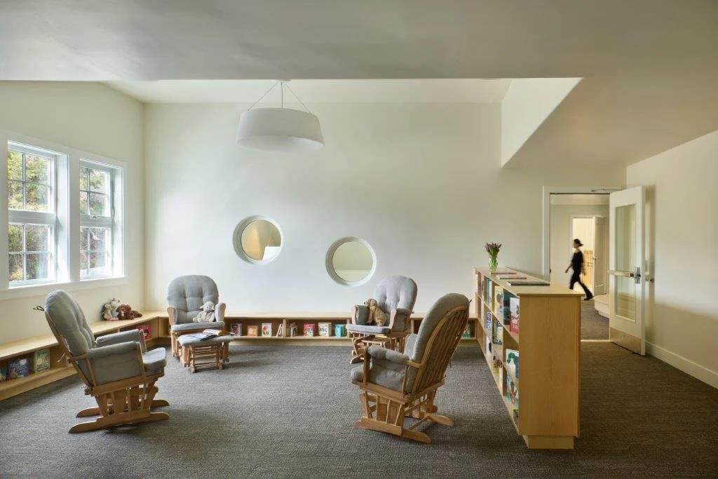 Evergreen Manor Family Center is a licensed residential treatment facility designed to allow moms in recovery to remain with their children while getting treatment. Conceived as a therapeutic, home-like setting, the project expands an existing treatment campus across the street. The new building provides 18 studio-style family units and a five classroom early learning center for up to 50 children. Shared common spaces include a dining room for 80, vaulted living room, rocking–and-reading room, and a children’s “big energy” recreation room. The family units have separate sleeping spaces for moms and kids, private bathrooms and kitchenettes. The rooms and spaces are organized to support the practice of daily routines.