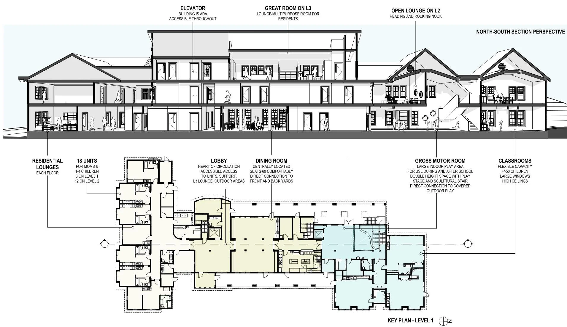 As part of the project, the expanded campus gained extensive landscaping and recreation areas, including a vacated street transformed into a landscaped commons where moms and their kids can play and stroll safely. The project’s site development, residential forms, and materials reflect the client’s desire for a welcoming, contextual building that enhanced the existing campus and neighborhood. Partially funded by state and local grants, the project required a complex mix of land use approvals, including a rezone, street vacation, and long-term lease coordination, to support this first-of-its-kind facility in Washington State.