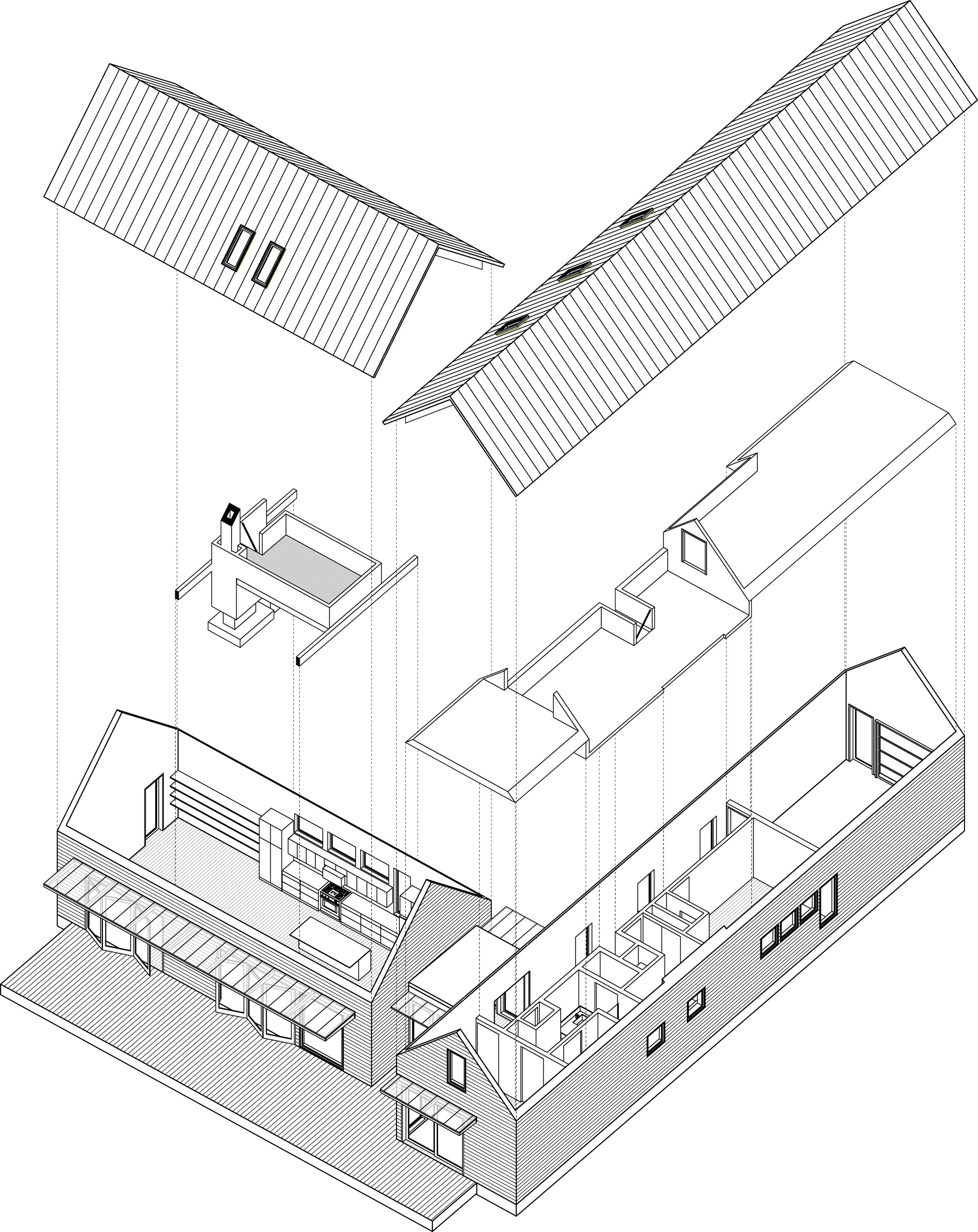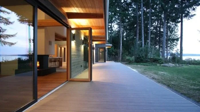 Cedar siding, finished with grey pine tar, offers a protective envelope that echoes weathered wood structures in the area. The interiors feature exposed glulam beams, rift-sawn white oak floors, fir windows and cabinets. Small-and-large-scale operable windows, skylights, and clerestories provide passive ventilation and expansive daylighting. High-efficiency systems and natural materials contribute to long-term comfort and indoor air quality.