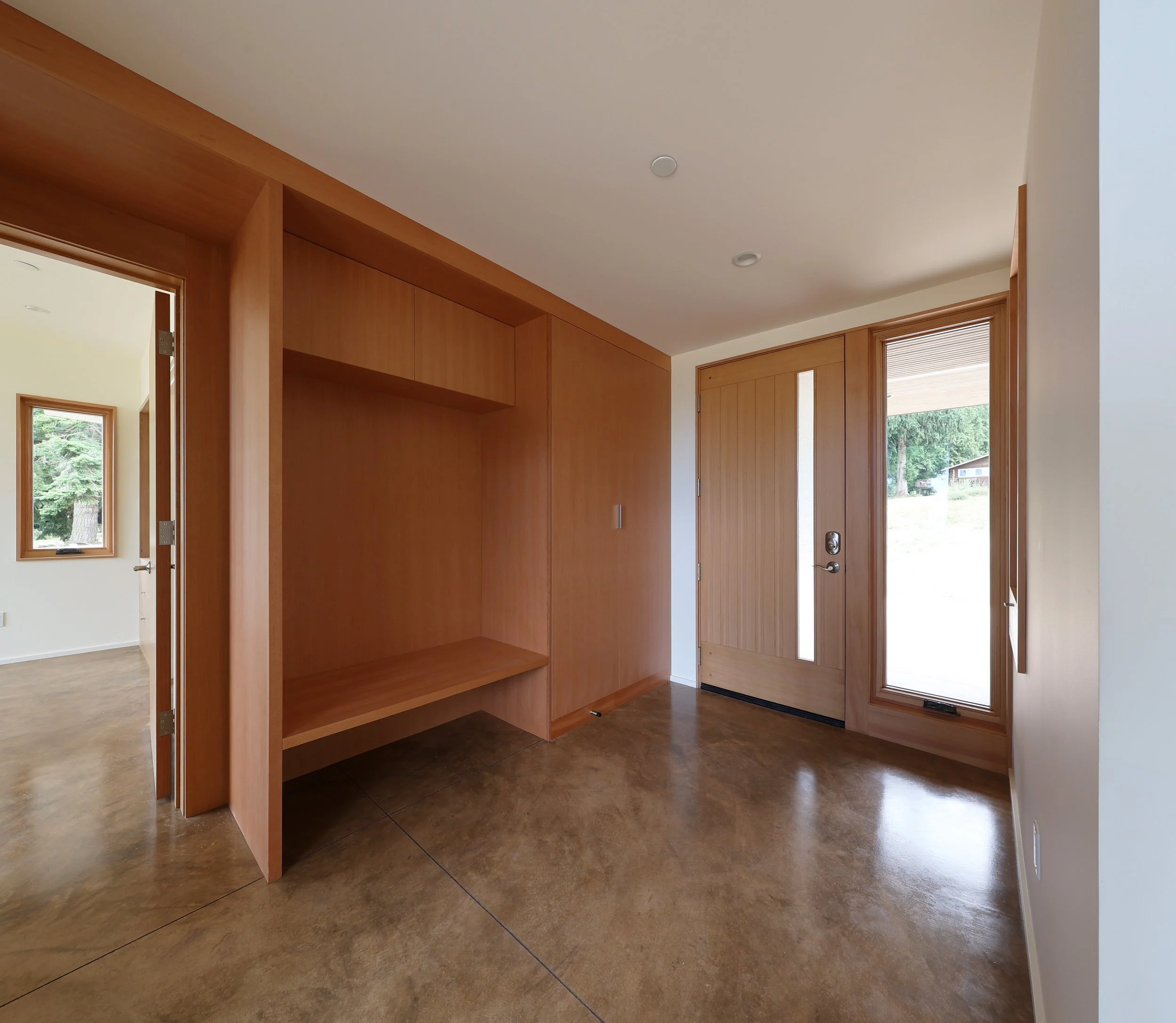 A preserved multi-trunk big leaf maple guided the final siting and anchors the landscape plan. Ribbed metal cladding, chosen for durability and low maintenance, has muted tones that echo the trees and catch shifting coastal light. Inside, stained concrete floors pair with warm fir and oak woodwork. Daylighting, passive and natural ventilation, radiant heating and cooling all help sustain a comfortable, healthy environment throughout the year.