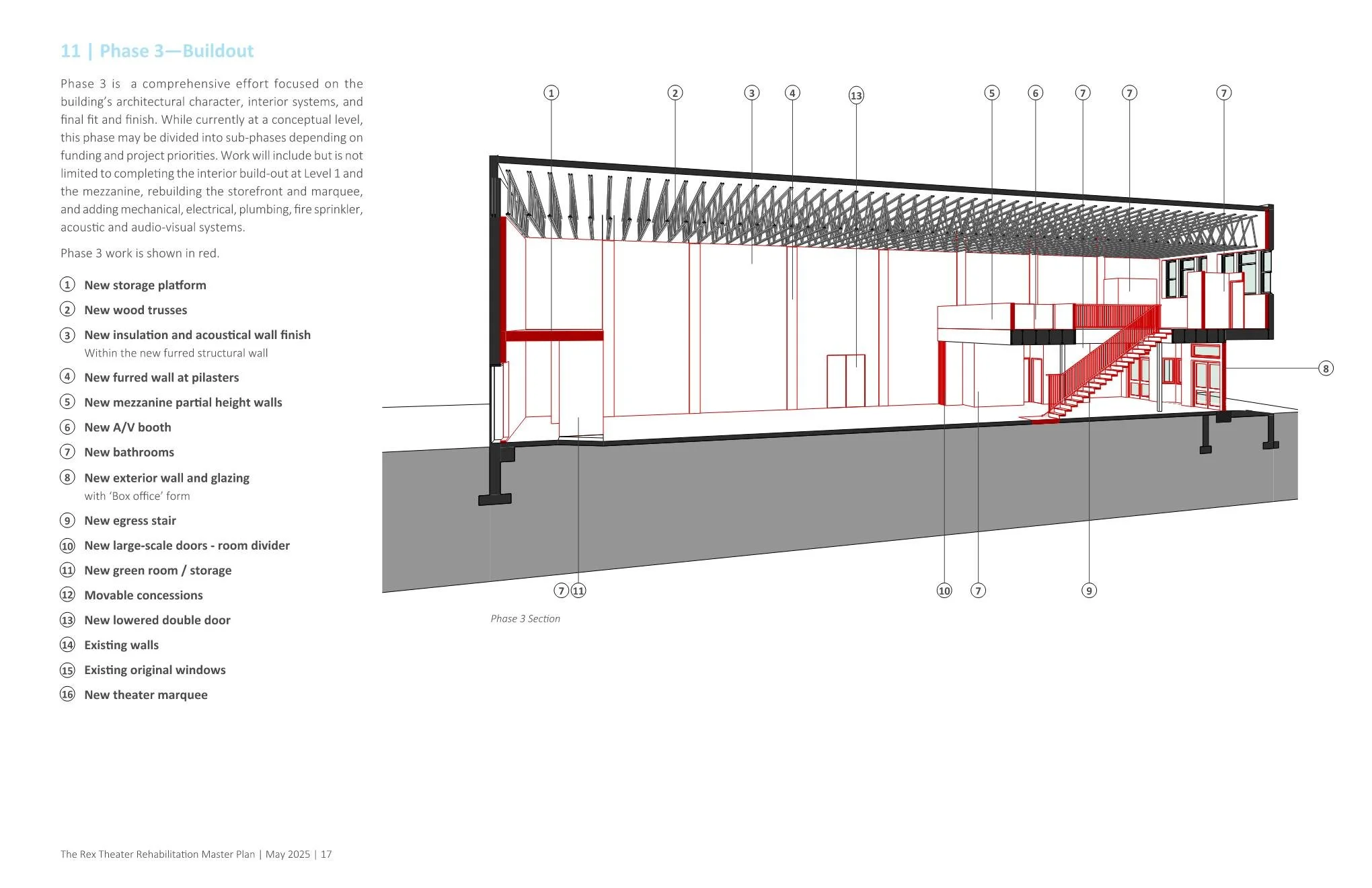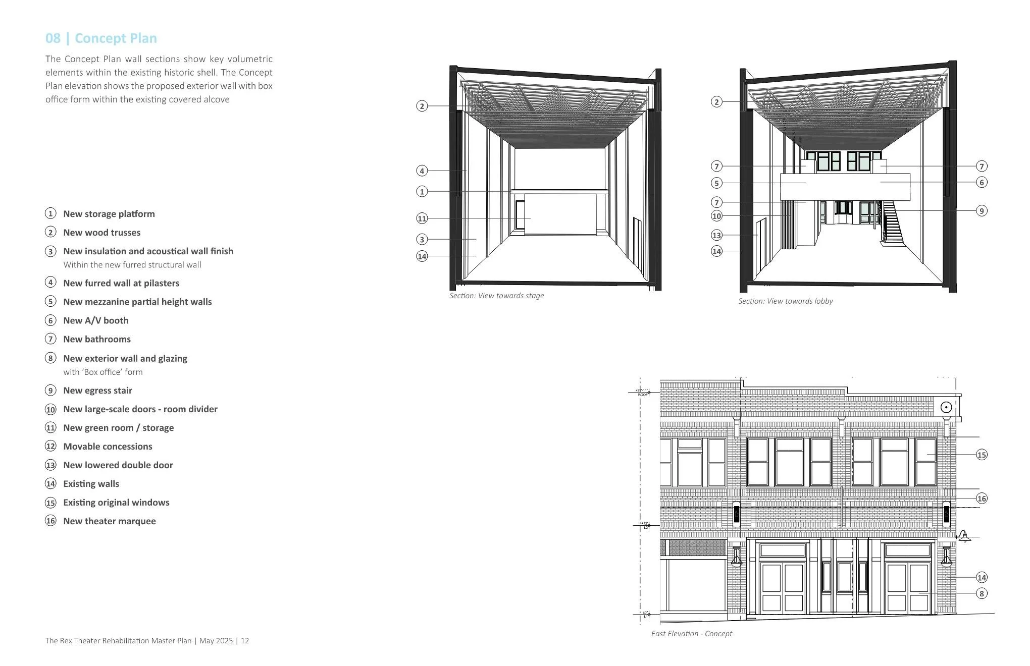 Bushnaq Studio engaged with efforts to revive the Rex in 2010 and reengaged in 2020, collaborating with the Foundation on a phased rehabilitation strategy. Our work includes programming and planning for the theater’s revitalization, along with grant writing and capacity building for the nonprofit. In 2025, Bushnaq Studio led a grant-funded master plan process, which culminated in a Concept Plan for phased rehabilitation. The plan outlines near-term work to safeguard the building shell and improve accessibility, and a road map for its full build-out over time. The phased approach sets the stage for incremental progress, interim use, and long-term transformation—helping the Foundation ensure each investment contributes to the Rex’s eventual full rehabilitation while also allowing the theater to be used in between phases.