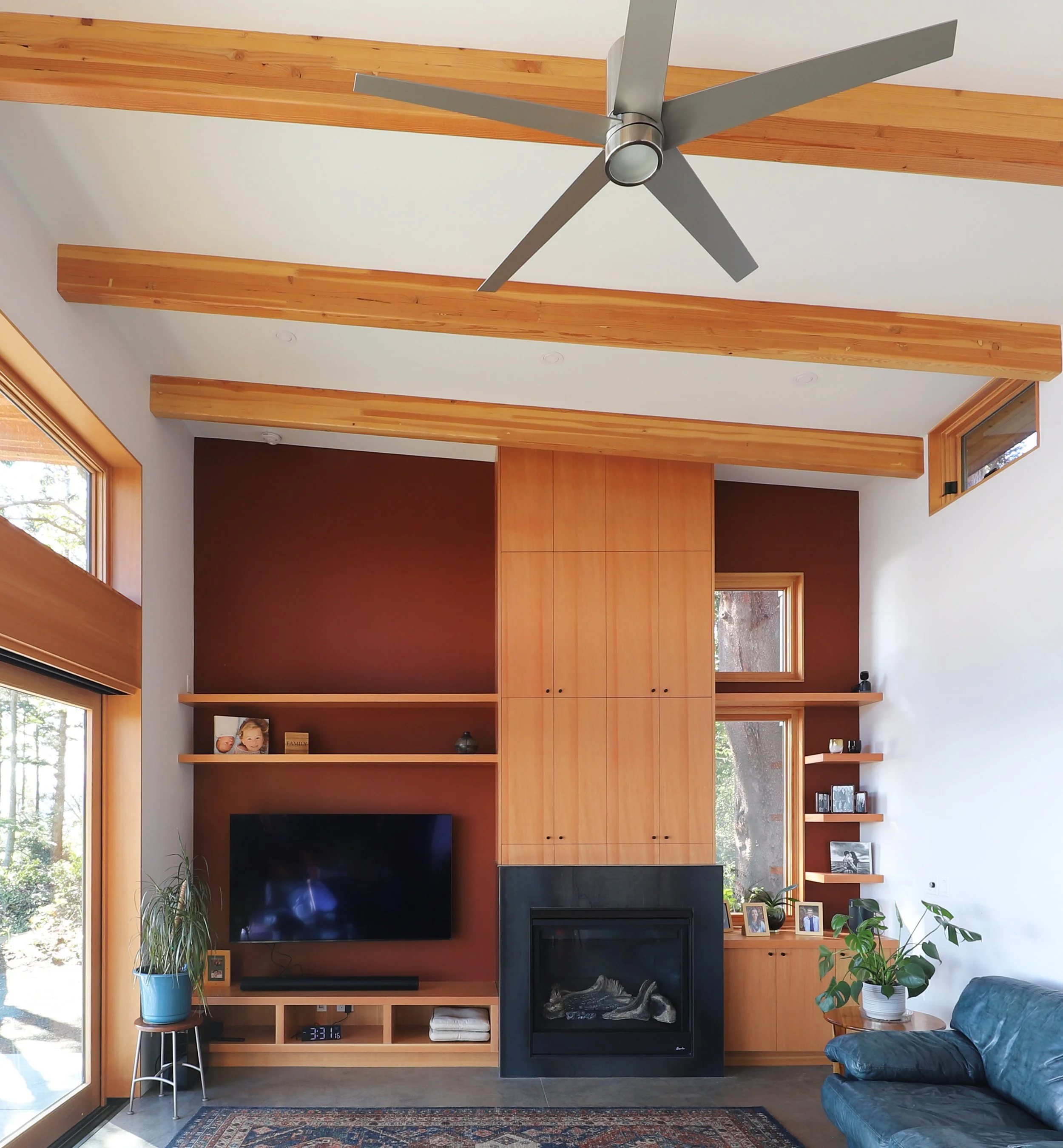 Outside, durable metal siding and roofing form a resilient shell that references regional maritime structures. Inside, vaulted ceilings, exposed beams, and natural finishes add texture and warmth to light-filled interiors. Expansive glazing and clerestory windows capture water views and daylight. Small-and-large scale operable openings provide passive ventilation, bringing in breezes and the sounds of wildlife. A broad roof helps manage strong winds and summer sun, extending over a covered patio for outdoor dining.
